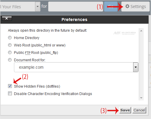 4. If the .htaccess file is not visible, click Settings in the top right corner of the File Manager. In the settings window, check the box next to Show Hidden Files (Dotfiles) and click Save. The .htaccess file should now be visible. If it is still not there, you can create a new one.