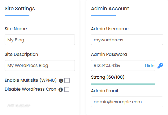 - Admin Username: Your new WordPress username (for security reasons, do not use the administrator or the admin username).