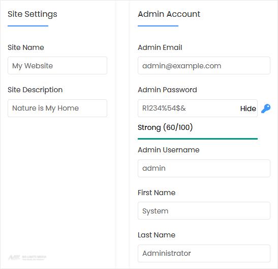 • Admin Username: Your new Pubvana username (for security reasons, do not use the administrator or the admin username).