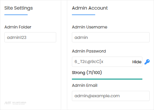 - Admin Folder: Enter the name of your admin folder, such as admin123.