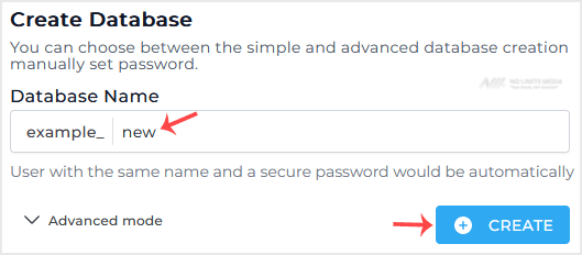 3. In the Database Name field, enter your desired name for the database. Then, click the Create button located in the bottom right corner.